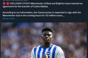 喀麦隆媒体CFOOT报道称,曼联已经与布莱顿就巴莱巴转会达成协议,球员预计将在未来几个小时与曼联签约,费用1.12亿欧元。