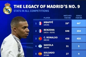 体育资讯8月9日讯 皇马官方宣布,恩德里克将身穿9号球衣,德国转会市场盘点了皇马近10位9号球员。 德转盘点皇马近10位9号球员: 姆巴佩(24/25)——59场44球 本泽马(10/11-22/23)——648场354球 C罗(09/10)——438场450球 萨维奥拉(08/09)——31场5球...
